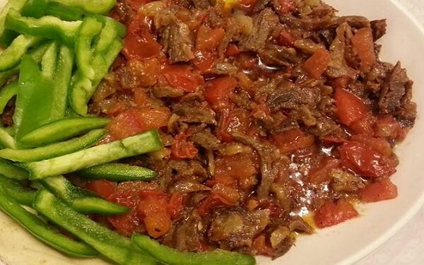 2. يحمرالبصل في ملعقة زيت ويضاف الطماطم المقطعة مكعبات ثم يضاف اللحم المسلوق للبصل والطماطم ويقلب. يرش عليها ملح وكاري حسب الرغبة. يمكن استعمالها مع المعكرونة المسلوقة وصحتين وهناء.