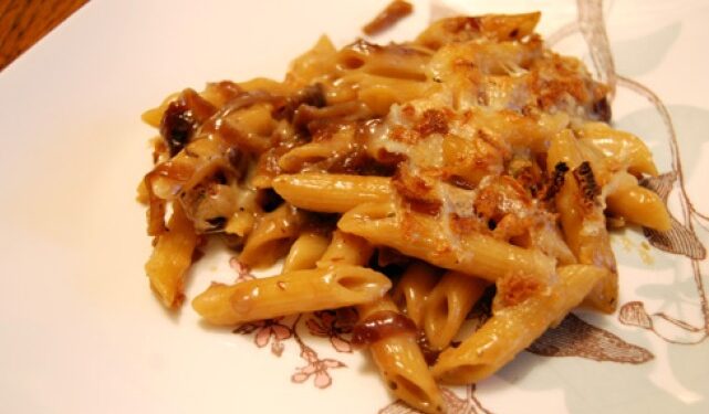 3. نبشر البصل ونتبلة باالملح والفلفل ونتركة 5 دقائق مع المكرونة واللحم المفروم أيضاً.
