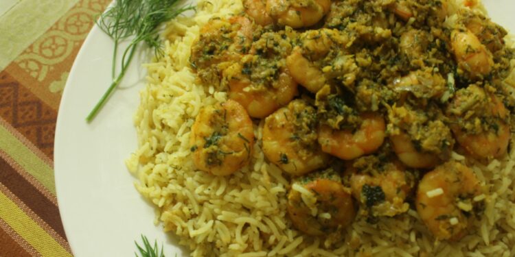 3. نضع البقدونس مع البصل ثم نضيف الروبيان المقشر.