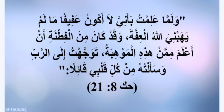 واللسان العفيف لا يستخدم ألفاظًا معيبة من الناحية الأخلاقية: فلا يتلفظ بكلمات جنسية بذيئة, ولا يذكر قصصًا أو فكاهات جنسية, ولا يقبل سماعها إن قيلت من غيره. ولا يردد أغاني من نفس النوع, بل يخجل من النطق بها, حتى فيما بينه وبين نفسه في مسكنه الخاص. إنه لا يتدني إلي هذا الوضع. يمنعه أدبه من استخدام لغة لا تتفق وهذا الأدب الذي تعوده.