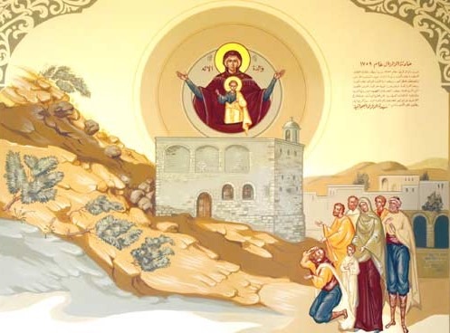 لعلّها أقدم أيقونة في الكنيسة من حيث رسمها وزخرفتها. قبل ترميمها لم يكن ظاهرًا منها إلاّ وجه العذراء، ولكن بعد ترميمها، سنة 2005، وإزالة السّواد الّذي سبّبته الشموع المضاءة مقابلها، بان قدّيسون يحيطون بوالدة الإله الحاملة السّيّد على ذراعها.