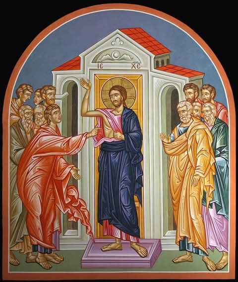 “وَبَعْدَ ثَمَانِيَةِ أَيَّامٍ كَانَ تَلاَمِيذُهُ أَيْضًا دَاخِلًا وَتُومَا مَعَهُمْ. فَجَاءَ يَسُوعُ وَالأَبْوَابُ مُغَلَّقَةٌ، وَوَقَفَ فِي الْوَسْطِ وَقَالَ: «سَلاَمٌ لَكُمْ!»