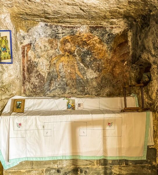 الكنيسة عبارة عن مغارة محفورة في الصخر ذات خوروسين، لعلّ جداريتها الأجمل هي الظهور الإلهيّ.