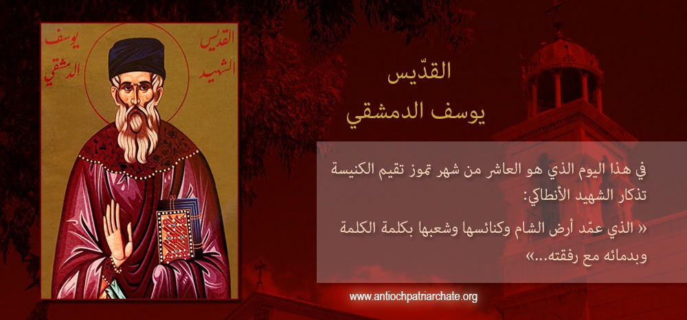 هلمّوا يا مؤمنون نكرّم شهيد المسيح كاهن بيعة أنطاكية يوسف الدمشقي. الذي عمّد أرض الشام وكنائسها وشعبها بكلمة الكلمة ودمائه مع رفقته، لأنه منذ الطفولية اصطبغ بنور الإنجيل، فعمل وعلّم وحفظ كنيسة المسيح وخرافها. فيا يوسف الدمشقي كن لنا قدوة وحافظاً وشفيعاً حاراً لدى المخلص.