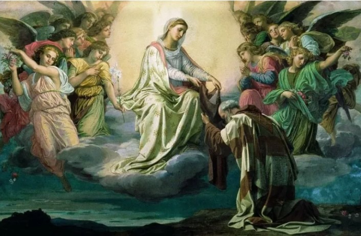 ففي 16 تمّوز/ يوليو 1251، ظهرت العذراء مع جوق الملائكة حاملة بيدها “ثوب سيّدة جبل الكرمل”، وهو عبارة عن قطعتي قماش متّصلتين بخيطين، إحداهما بيضاء اللّون تحمل صورة للعذراء مع الطّفل يسوع؛ والأخرى بنّيّة اللّون، اللّون الّذي طبع لباس الكرمل الرّهبانيّ.