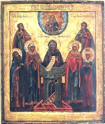 وأسفل الصورة وفي الوسط قام القديس سمعان العمودي على قمّة عموده والى يساره الشهيدتان القدّيستان أناستازيا Anastasia وبجانبها جولياناJuliana والى يمينه القديسة أغاثياAgathia وبجانبها القديس ديمتري من بريلوكي Dimitri von Priluki(توفى 11 شباط 1392). أما وسط الأيقونة والى الأسفل قليلا من سوية العذراء فقام الى اليمين القديس الراهب سافّا من فيتسيراSavva von der Visera (عاش في القرن الخامس عشر) ويقابله في اليسار القديس رومانوس من ميلودهRomanos der Melode، والأخير معروف بأنه أشهر من ألّف الأناشيد (التراتيل) البيزنطية المبكّرة.