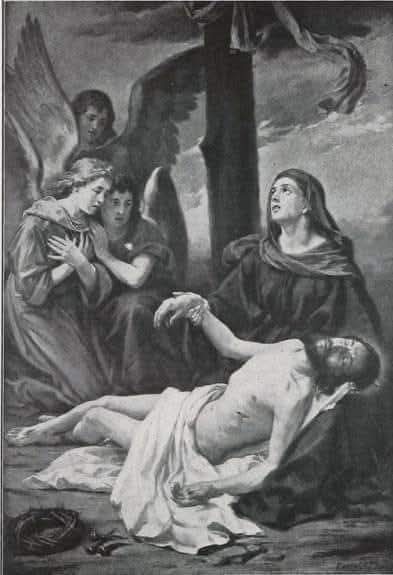 بعد أن رفعوا الصليب ، قد ترك الجنود يسوع معلقاً عليه في تلك الحال ليموت هكذا. فقد أهملوه على هذه الصورة وأمّا والدته البتول فلم تفارقه، بل أنها اقتربت أكثر قرباً من صليبه لتحضر موته. كما أخبرت هي نفسها للقديسة بريجيتا في الوحي قائلةً: أنني ما فارقت ابني يسوع، بل كنت واقفةً بالقرب من صليبه: الا أن القديس بوناونتورا يخاطب هذه السيدة بقوله: ماذا كان يفيدكِ يا سيدتي ذهابكِ الى جبل الجلجلة لتموتي أمام أبنكِ ؟؟!!