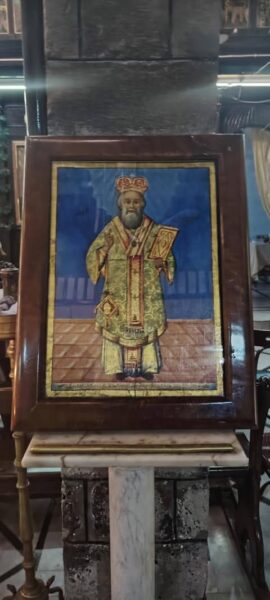 ايقونة القديس حنانيا الرسول شفيع الكنيسة وامها قنديل في هيكل الكنيسة وهي ايقونة اثرية من المدرسة السورية تعود الى القرن18