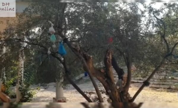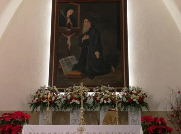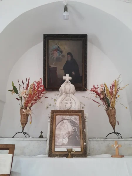 وفي الباحة الخارجية مزار حجري للعذراء مريم كما توجد شجرة زيتون تحمل نوايا المصلين حيث جرت العادة بتعليق حجر بمثابة نذر على هذه الشجرة لإنجاب الأطفال.