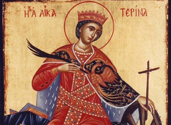 يظهر الى جانب القديسة كاترينا في ايقونتها، “دولاب” و”كرة” و”كتب”.