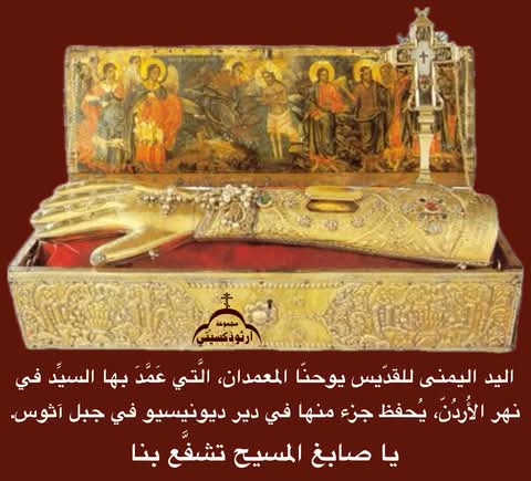 اليد اليمنى للقدّيس يوحنّا المعمدان، الَّتي عَمَّدَ بها السيِّد في نهر الأُردُنّ، يُحفظ جزء منها في دير ديونيسيو في جبل آثوس.