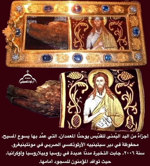 <span;>أجزاءً من اليد اليُمنى للقدّيس يوحنّا المعمدان، التي عمَّد بها يسوع المسيح، محفوظة في دير سيتينييه الأرثوذكسي الصربي في مونتينيغرو.
