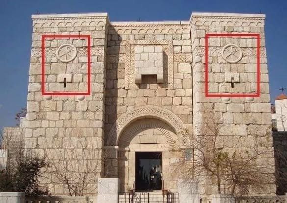 على جانبي هذا الباب نلاحظ وجود رمزان، وهما أول حرفين من إسم “المسيح” (Χριστός) “خريستوس”، باللغة الرومية (اليونانية) XP وهي العلامة التي ظهرت لقسطنطين الملك في السماء، على مشارف مدينة روما، ومعه هذه الحروف من نور Εν τούτω Νίκα أي «بهذا تنتصر». وكان ذلك قبل مواجهته لخصمه ماكسنتوس وانتصاره عليه. حيث أمر قسطنطين بوضع هذا «المونوغرام» على الدروع والأسلحة واعتمده راية لجنوده، واستمر ذلك لقرون طويلة.