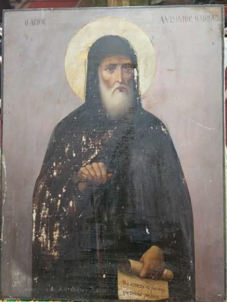 الأيقونة: للقديس أنطونيوس الموجودة في كنيسة دخول السيد إلى الهيكل بمقر مطرانية إرموبوليس (طنطا وتوابعها).
