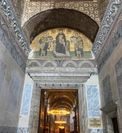 توجد بعض فسيفساء آيا صوفيا في صالات العرض في الطابق العلوي. إذا ذهبت إلى آيا صوفيا الآن، فقد لا ترى هذه الفسيفساء لأن الطابق العلوي لا يزال قيد الترميم.