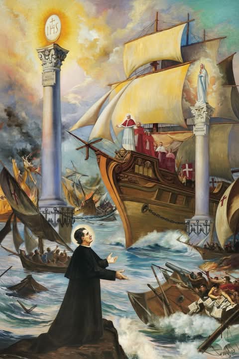 بدا لي أنَّ هيجان البحر وسرعة الرّياح المُعاكسة كانا لفائدة الأعداء. غير أنّي رأيتُ في وسط البحر، عمودَين عاليَين يطوفان أمام سفينة البابا: على العمود الأوّل (وهو أعلى بكثير من الثّاني)،  دُوِّنَ عليه عبارة ‘ القربان المقدَّس- خلاص المؤمنين‘. وعلى العمود الثاني، ظهر عليه تمثالٌ للعذراء البريئة من الدَّنَس، مع لوحة كُتبت عليها: ‘نجدة المسيحيّين‘. لم يكُن لسفينة البابا أيّة وسيلةٍ بشريّة للدّفاع.