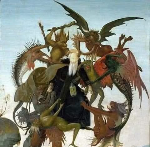 هكذا أطلق الفنان ” مايكل أنجلو” على لوحته العالميه عن الانبا انطونيوس الذى يظهر فيها كشيخ ممتلئ حكمه لم تتركه الشياطين وصارت تعذبه بحروب شديده وصلت للأيذاء الجسدى كما ورد فى سيرته ” كانوا يهجمون عليه ويضربونه ضربا مؤلما”….”وأقام هكذا ثلاثين سنه حتى نظر الله الى كثرة صبره وأحتماله” …
