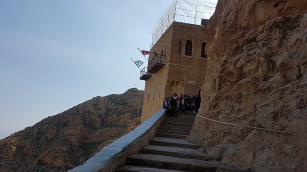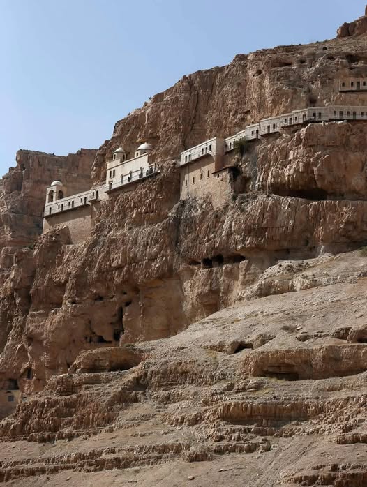 الى بطن الجبل، تصل الطريق الوعرة، الشديدة الانحدار… على خطى السيد المسيح، في تلك البرية حيث اعتزل فيها وصام، قاهرا الشيطان. السلّم الصغير داخل الكنيسة المزينة بايقونات جميلة اثرية، يقود الى كهف. وفقاً للتقليد، “فيه امضى 40 يوماً صائماً، مصلياً. وفيه ايضا قال للشيطان: ليس بالخبز وحده يحيا الانسان”. وهناك ايضا صخرة، يقال ان المسيح اتكأ عليها خلال احدى تجاربه. على مرمى حجر من القمة، استلقى دير بأسوار منحوتة في الصخر… كأنه يتدلى من السماء. ولا أبهى.