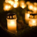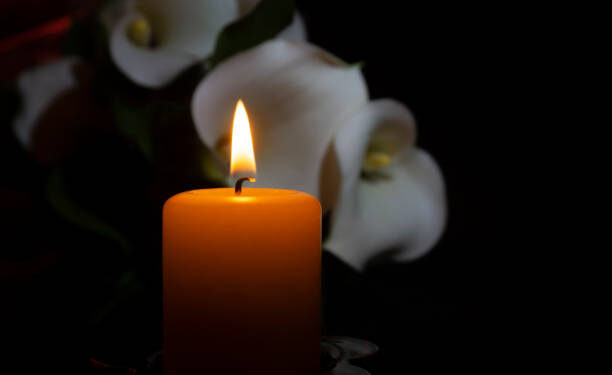 A close up of an orange candle and flame and lily flowers on a dark background.